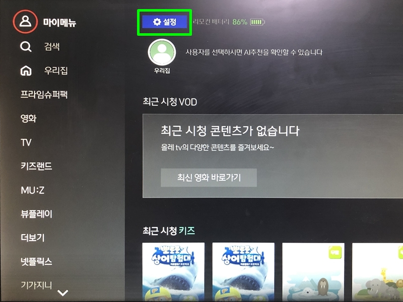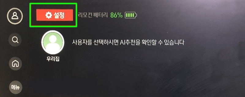 리모컨의 오른쪽 화살표를 누르셔서 초록색 박스의 [설정]을 눌러주세요.